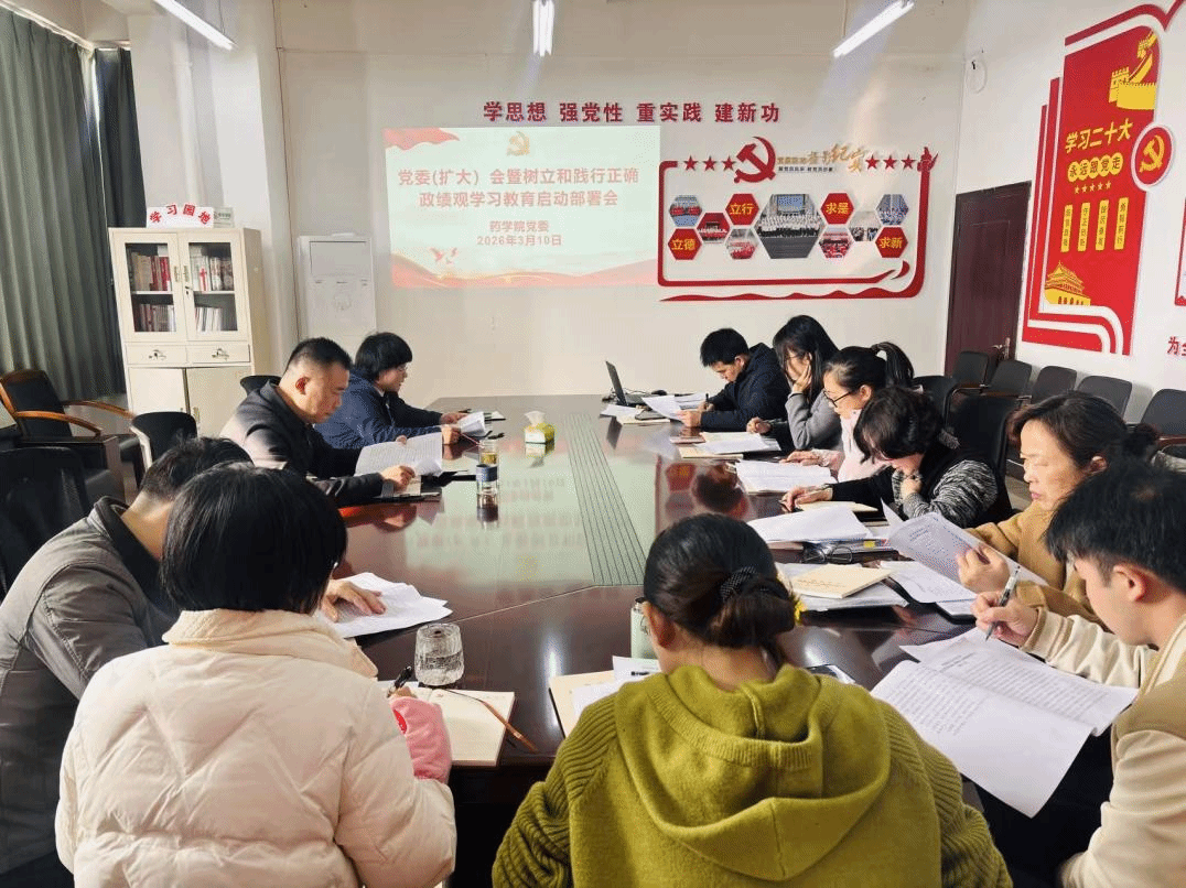 3月10日上午,药学院召开党委(扩大)会暨树立和践行正确政绩观学习教育启动部署会,该院党委领导班子、各党支部书记参加会议。该院党委书记彭磊主持会议并作启动部署讲话。会上,学院党委副书记罗丽萍传达学习了中央、省委、省委教育工委和学校相关会议精神和通知要求。会议指出,开展树立和践行正确政绩观学习教育,是贯彻落实党的二十届四中全会精神、确保“十五五”开好局起好步的必然要求,是坚持为党育人、为国育才初心使命的重要举措,...