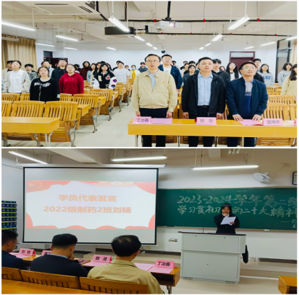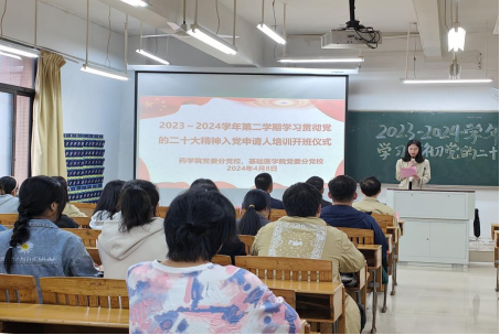4月8日晚,药学院和基础医学院在黄金校区举行2023~2024学年第二学期学习贯彻党的二十大精神入党申请人培训开班仪式暨培训第一讲,药学院党委委员、副院长丁冶春、各学生党支部书记及全体入党申请人共70余人参加。