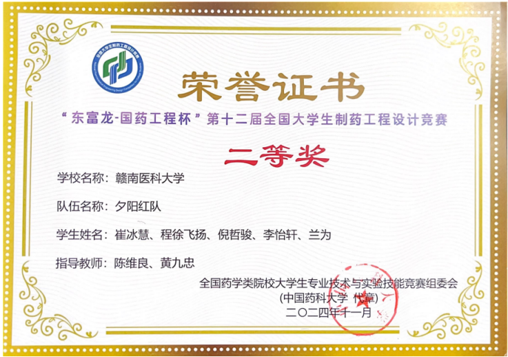 近日,由全国药学类院校大学生专业技术与实验技能竞赛组委会主办、重庆理工大学承办的“东富龙-国药工程杯”第十二届全国大学生制药工程设计竞赛全国总决赛落下帷幕。我校药学院师生表现优异,斩获全国二等奖2项,三等奖1项。其中,由陈维良、黄九忠老师共同指导的“夕阳红队”(崔冰慧、程徐飞扬、倪哲骏、李怡轩、兰为)和彭孝鹏、殷华峰(江西青峰药业)老师共同指导的“总包工头队”(葛泽昌、刘世朋、石桃红、谢倩、何玉文)均获得全国二等奖的好成绩;由陈伟铭、李林福老师共同指导的“啊对对对队”(方珊珊、高尤佳、欧阳宇博、何巍、毛伟)获得全国三等奖的好成绩。