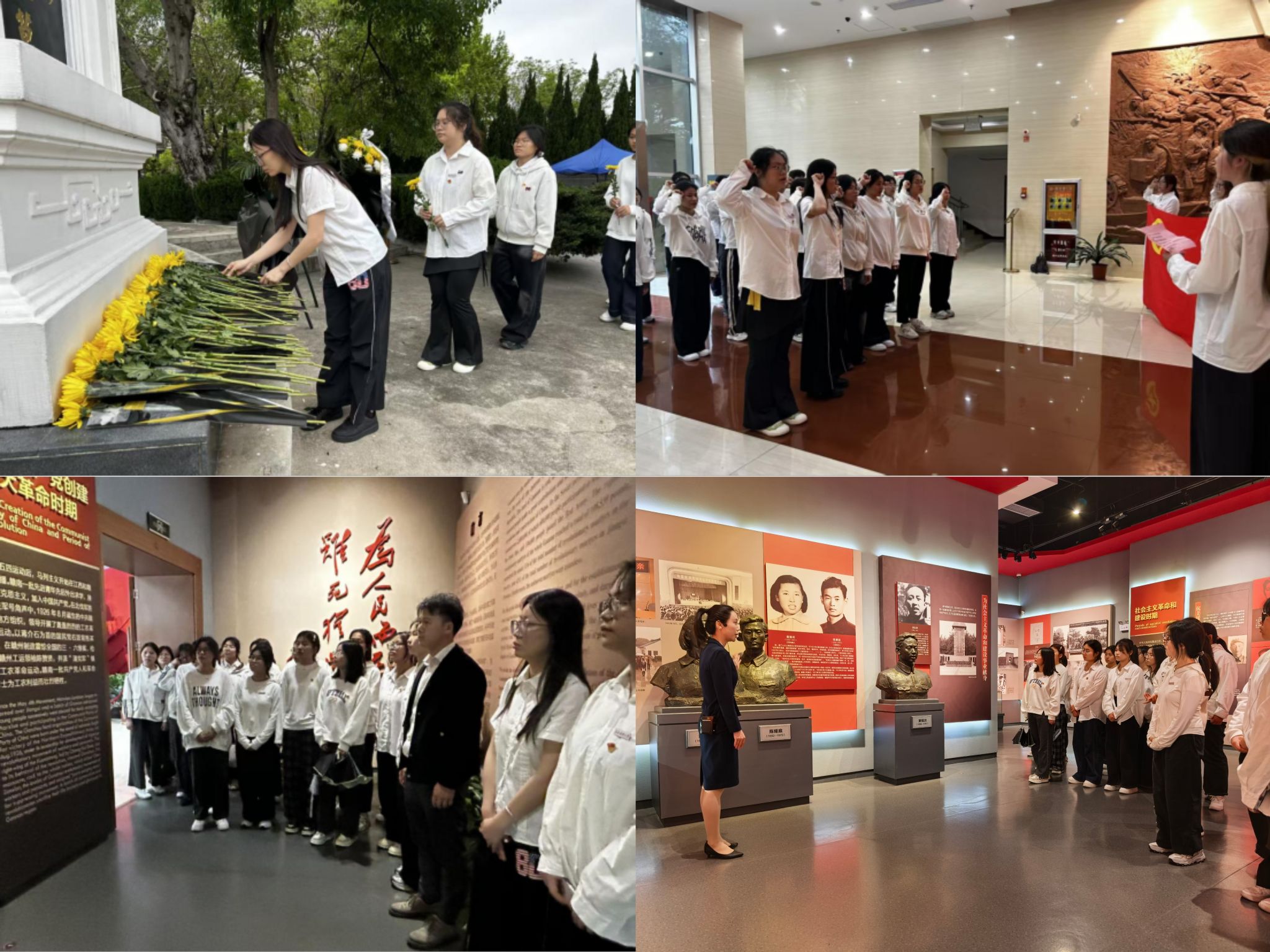 在庄严肃穆的革命烈士纪念碑前,全体同学整齐列队、神情凝重,集体肃立默哀,向为革命事业献出宝贵生命的先烈们表达最深切的悼念。党团员代表依次缓步上前,向烈士纪念碑敬献鲜花,并绕行瞻仰,以表达对革命先辈的无限敬仰与缅怀之情。在纪念馆内,大家认真聆听讲解员深情讲述赣南革命先烈的英勇事迹,重温入团誓词,并在珍贵的历史图片前驻足学习。一段段感人至深的历史、一张张见证岁月的图片,将大家带回了那段烽火连天的峥嵘岁月。