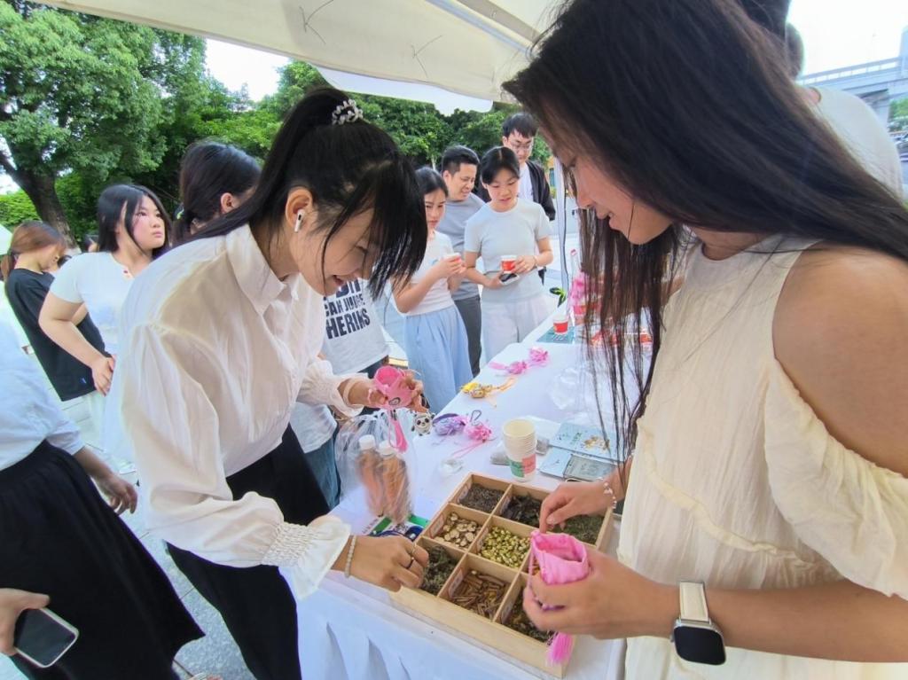 在热闹非凡的文明集市现场,药学院带来的自制香囊与自研的“白刺香薷饮”特色饮品大放异彩,吸引了众多师生的目光,成为活动现场当之无愧的热门产品。这些产品不仅充分展现出中医药文化的独特魅力,更彰显了药学院学生优秀的创新实践能力,收获了现场师生的一致好评。