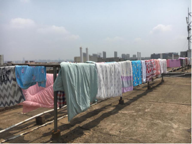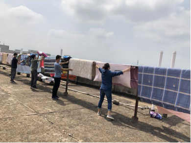他们将所有棉被、垫子、竹席等床上用品全部搬到楼顶晾晒。细心的老师们专门对床铺和被子进行编号、拍照、做标记,以免出现混淆,确保晒完后放回原处,恢复原样。