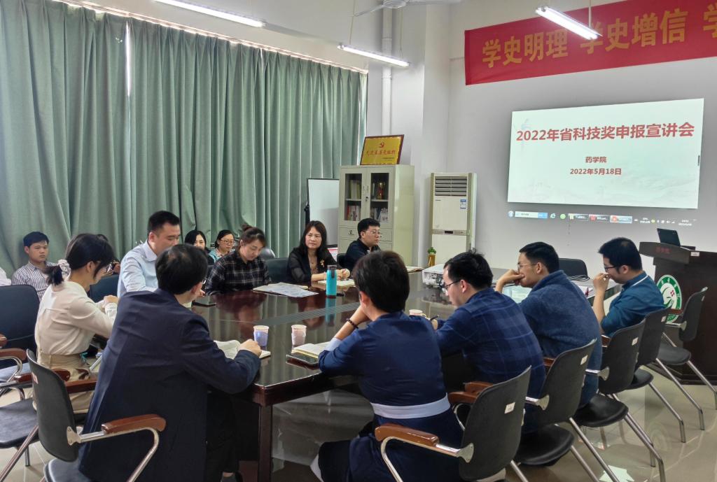 5月18日,学校科研处处长陶钧、副处长王烈峰到药学院开展2022年江西省科学技术奖申报工作宣讲动员。药学院院长范小娜主持,药学院党委书记彭磊、副院长丁冶春、黄浩及学院全体博士教师、硕士研究生指导教师及有意向报奖的老师到场聆听。