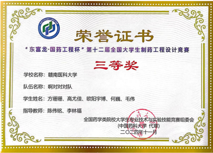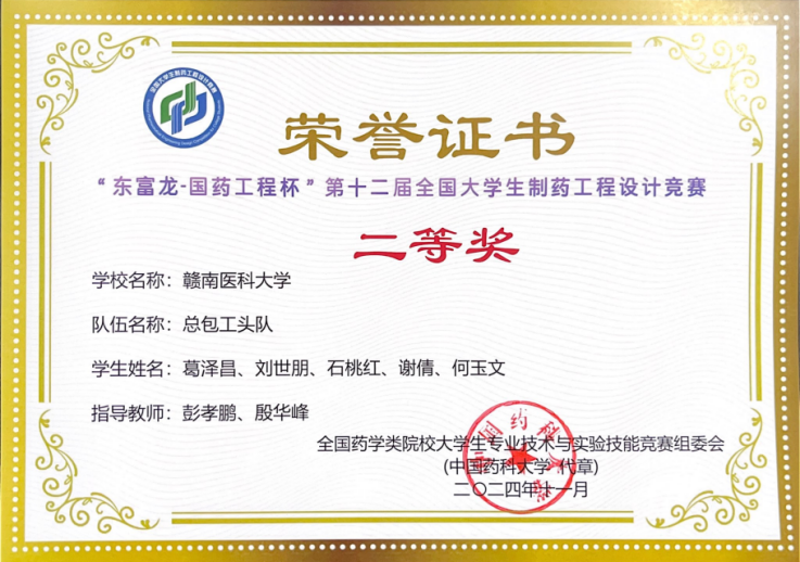 近日,由全国药学类院校大学生专业技术与实验技能竞赛组委会主办、重庆理工大学承办的“东富龙-国药工程杯”第十二届全国大学生制药工程设计竞赛全国总决赛落下帷幕。我校药学院师生表现优异,斩获全国二等奖2项,三等奖1项。其中,由陈维良、黄九忠老师共同指导的“夕阳红队”(崔冰慧、程徐飞扬、倪哲骏、李怡轩、兰为)和彭孝鹏、殷华峰(江西青峰药业)老师共同指导的“总包工头队”(葛泽昌、刘世朋、石桃红、谢倩、何玉文)均获得全国二等奖的好成绩;由陈伟铭、李林福老师共同指导的“啊对对对队”(方珊珊、高尤佳、欧阳宇博、何巍、毛伟)获得全国三等奖的好成绩。