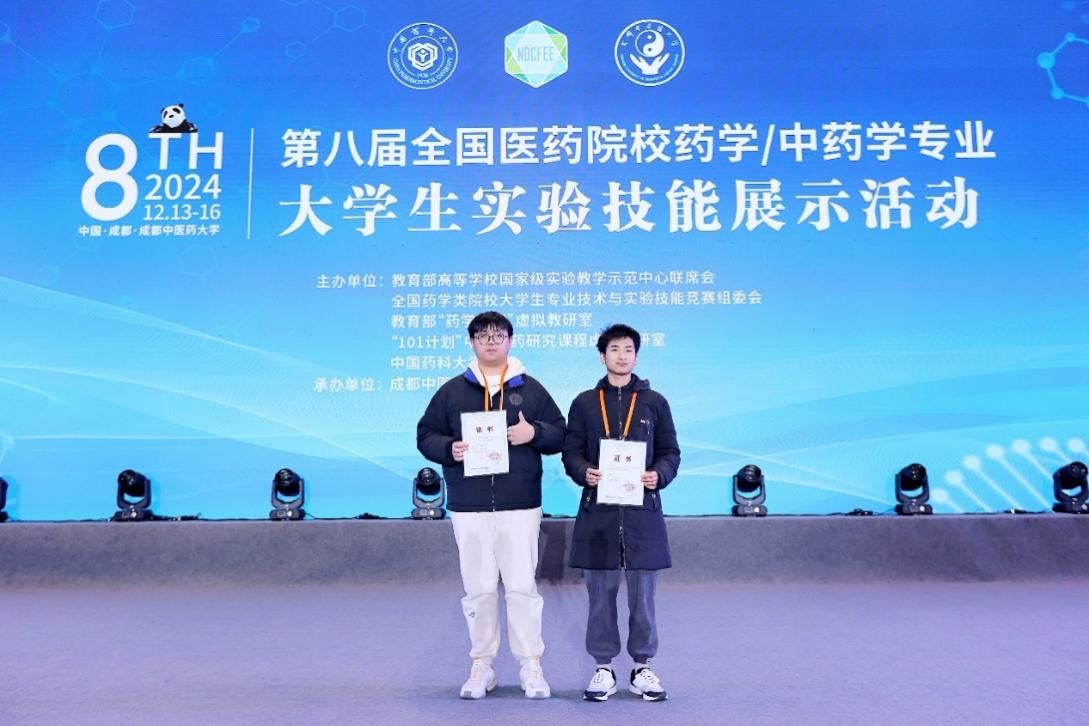 12月14-15日,第八届全国医药院校药学/中药学专业大学生实验技能展示活动在四川成都举行。经过激烈比拼,我校药学院两位参赛学生发挥稳定,表现优异,2021级药学本科生艾驰、2021级中药学本科生邱材生均荣获三等奖。