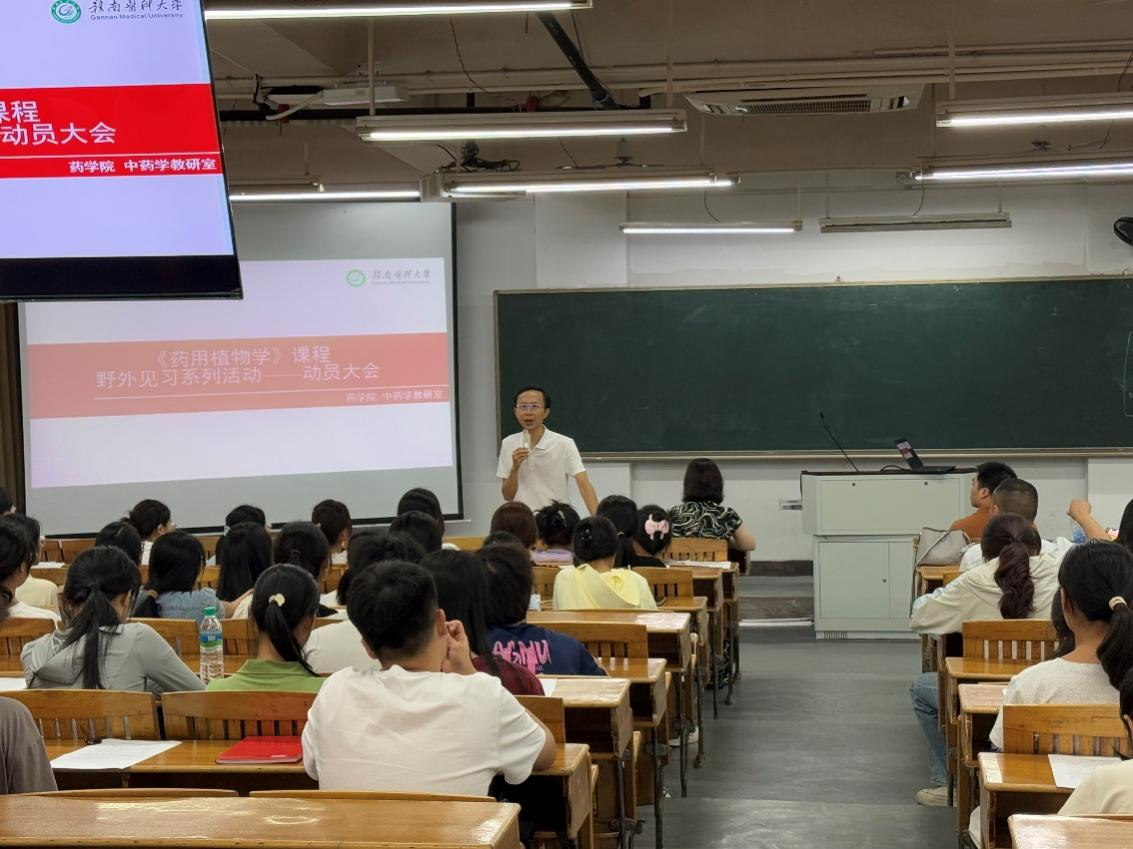 6月13日,药学院在黄金校区举行2025年《药用植物学》课程野外见习动员大会。该院副院长丁冶春、中药学教研室教师及2024级中药学专业本科1、2班全体同学参加。 会议由教研室主任彭金年主持。