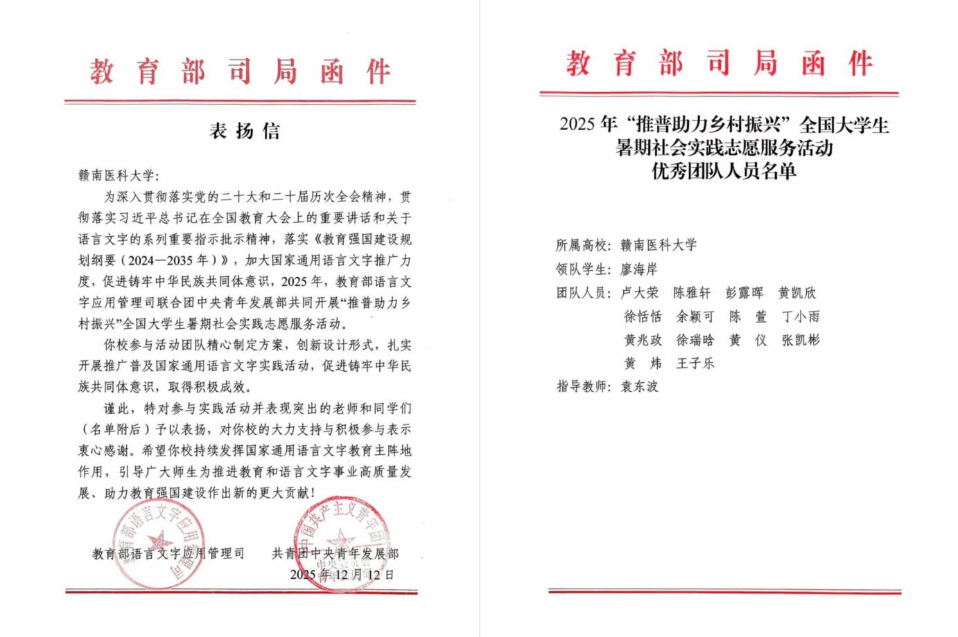 近日,教育部语言文字应用管理司与共青团中央青年发展部联合向我校发来表扬信,对药学院“红药匠”实践队在推广普及国家通用语言文字、促进铸牢中华民族共同体意识方面取得的积极成效给予高度肯定。这是学校深化“红医魂”党建品牌建设、以红医精神铸魂育人的生动体现。