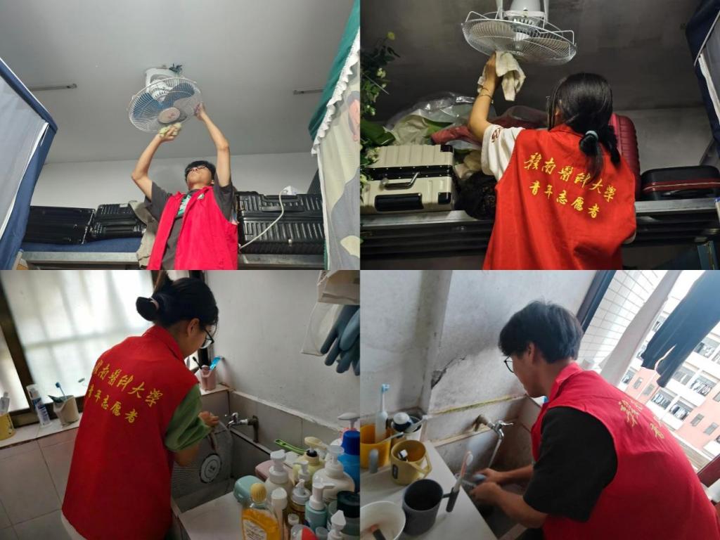 活动现场,身着统一志愿服装的志愿者们化身“宿舍美容师”,手持专业清洁工具,分组有序前往各宿舍开展工作。在风扇清洁环节,志愿者凭借熟练的操作技巧,小心拆卸风扇罩、叶片等组件,使用软毛刷仔细清理叶片缝隙中的顽固积尘,用抹布反复擦拭风扇网罩,直至洁净如新。对于空调外机区域,志愿者不放过任何一个角落,认真清理枯枝落叶、杂物,确保外机通风顺畅。每一个动作都细致入微,每一处清洁都饱含着对同学们的关怀。
